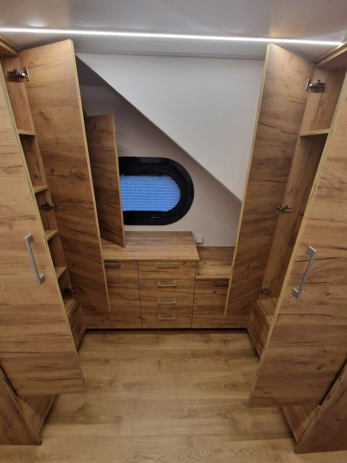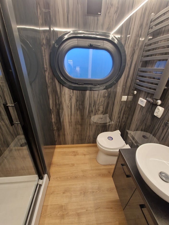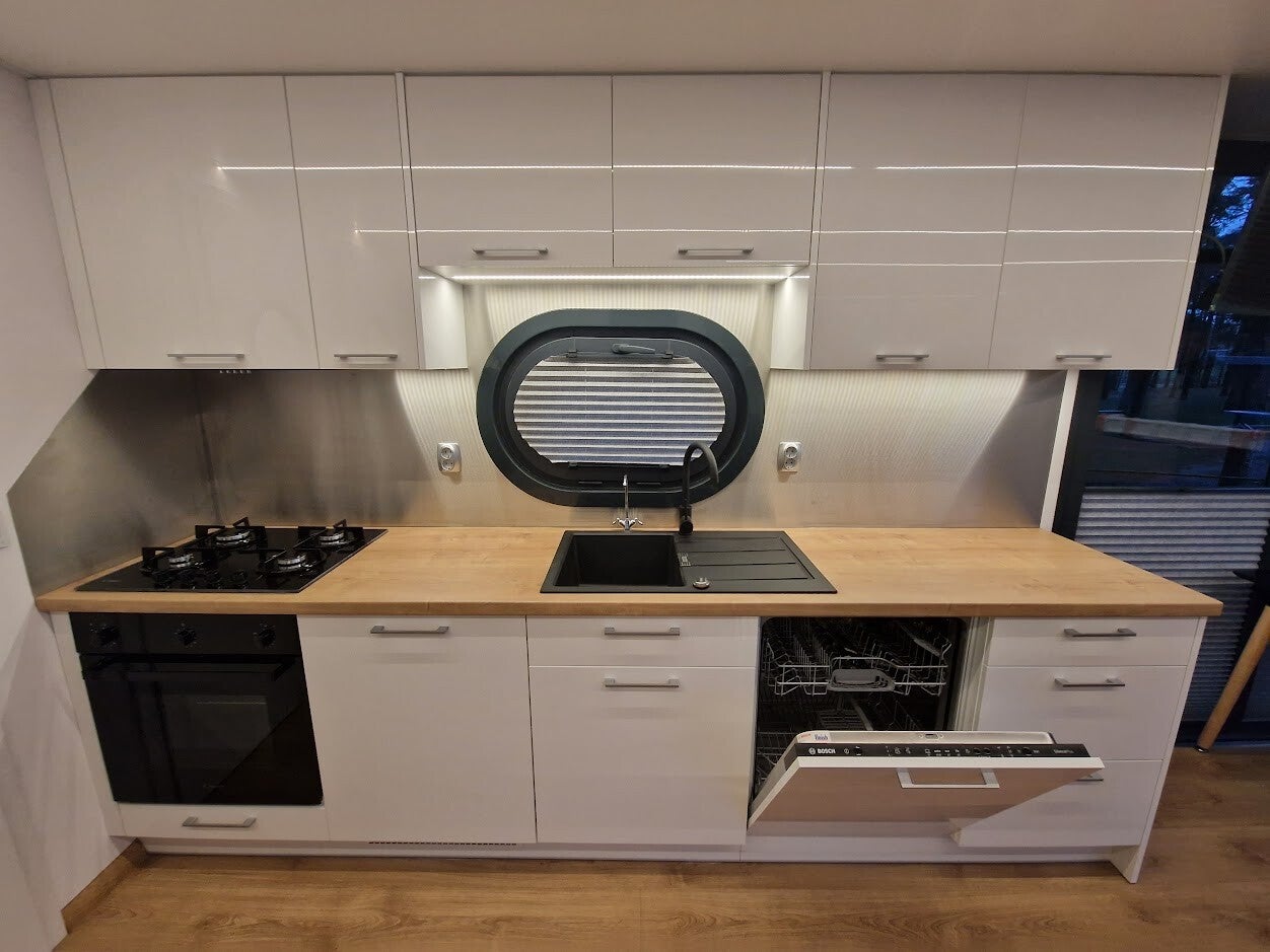 Le CAMPI 400 est notre première véritable maison flottante. Il peut être utilisé comme maison de vacances ou comme résidence principale. Il dispose d'un grand salon/salle à manger avec un grand canapé d'angle et d'une très grande cuisine. De larges baies vitrées coulissantes délimitent délicatement l'espace de vie et la grande terrasse inférieure, qui peut facilement accueillir une table pour plusieurs personnes et un barbecue à gaz, par exemple. Cette péniche peut être construite avec une ou deux chambres à coucher, avec emplacements pour les armoires et les rangements. La salle de bains spacieuse est dotée d'une grande cabine de douche.